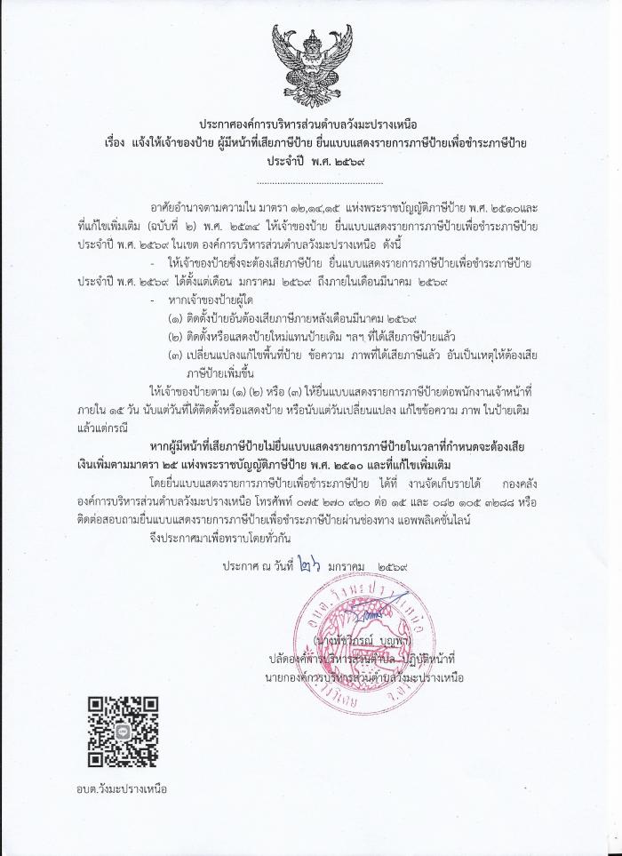 เเจ้งเจ้าของป้าย ผู้มีหน้าที่เสียภาษีป้าย ยื่นแบบเเสดงรายการภาษีป้ายเพื่อชำระภาษีป้าย ประจำปี พ.ศ. 2569