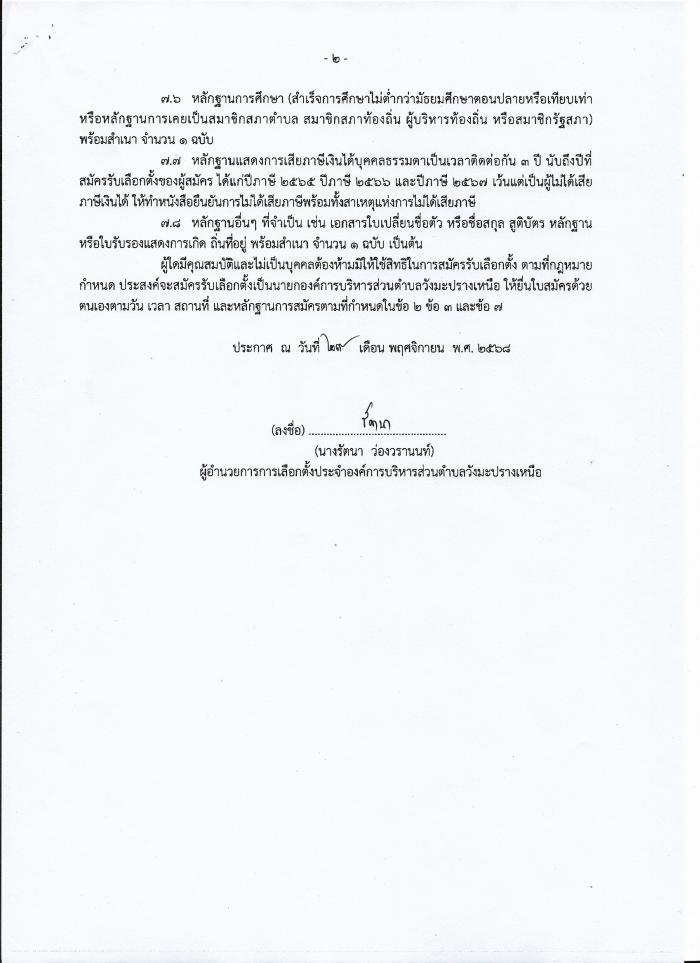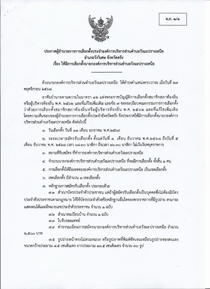 เรื่อง ให้มีการเลือกตั้งนายกองค์การบริหารส่วนตำบลวังมะปรางเหนือ