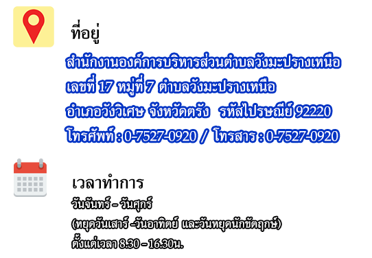สำนักงานองค์การบริหารส่วนตำบลวังมะปรางเหนือ ตำบลวังมะปรางเหนือ อำเภอวังวิเศษ จังหวัดตรัง : www.wangmaprangnuar.go.th